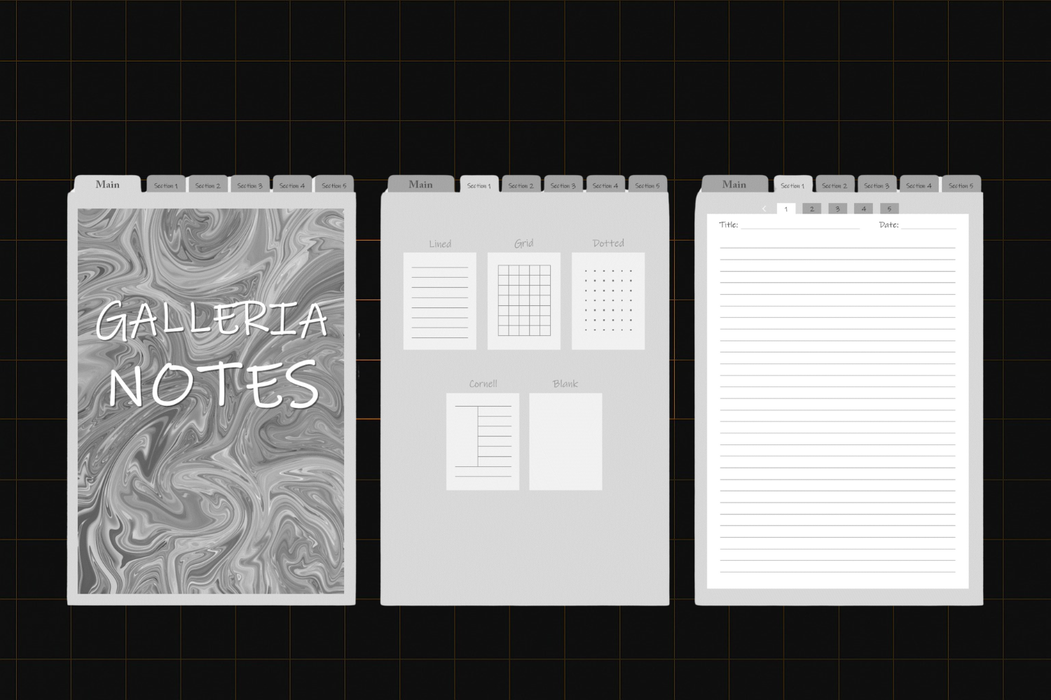 The Galleria Notes 3 pack uses geometric panels reminiscent of modern gallery walls—perfect for organizing concepts, sketches, or to-do lists in style.